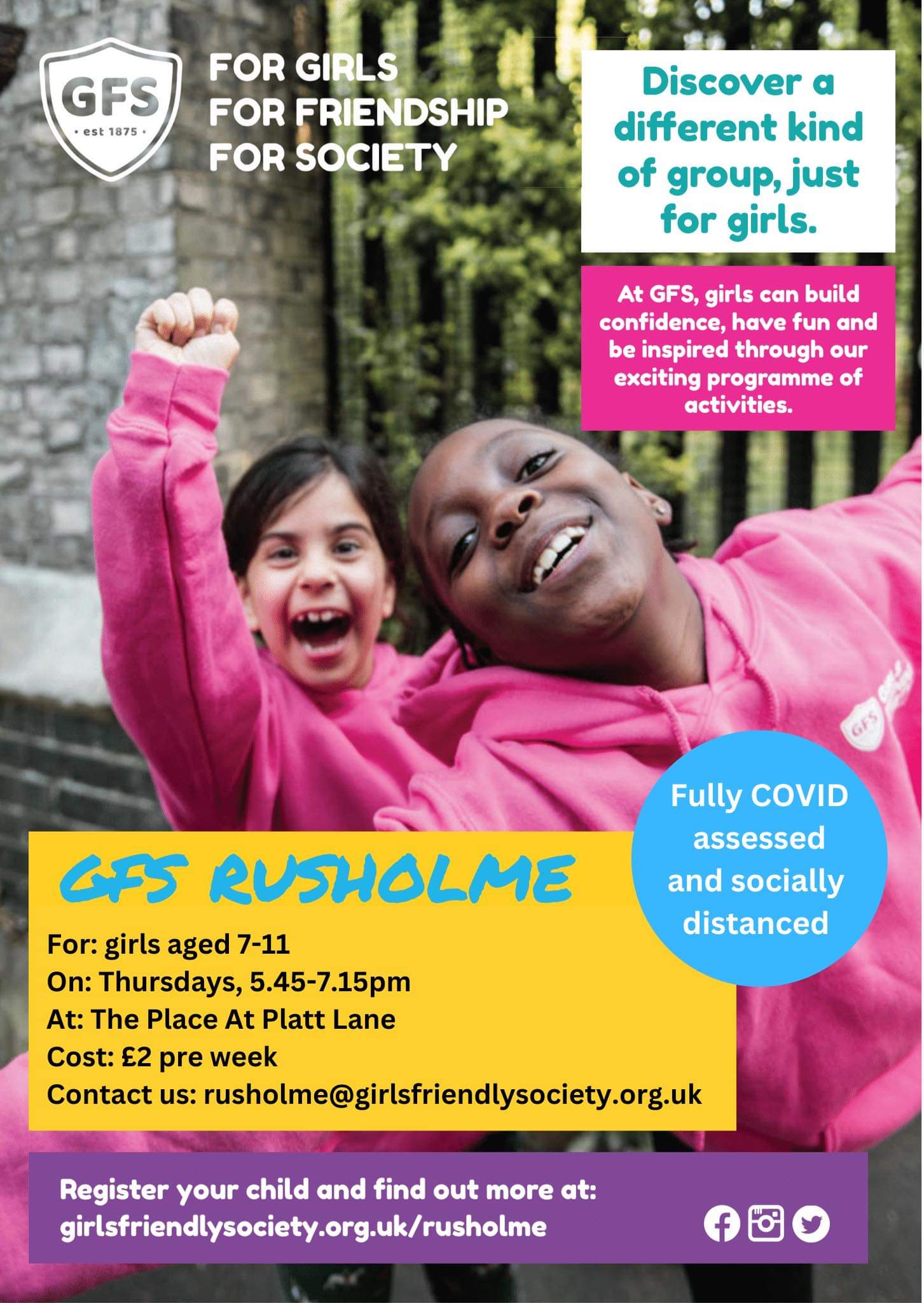 We are excited to be able to help promote the GFS Rusholme group who are helping our girls aged 7 - 11 years. These sessions will run during term time at The Place on Platt Lane. This group will be a great way for our girls to meet new friends and gain in confidence